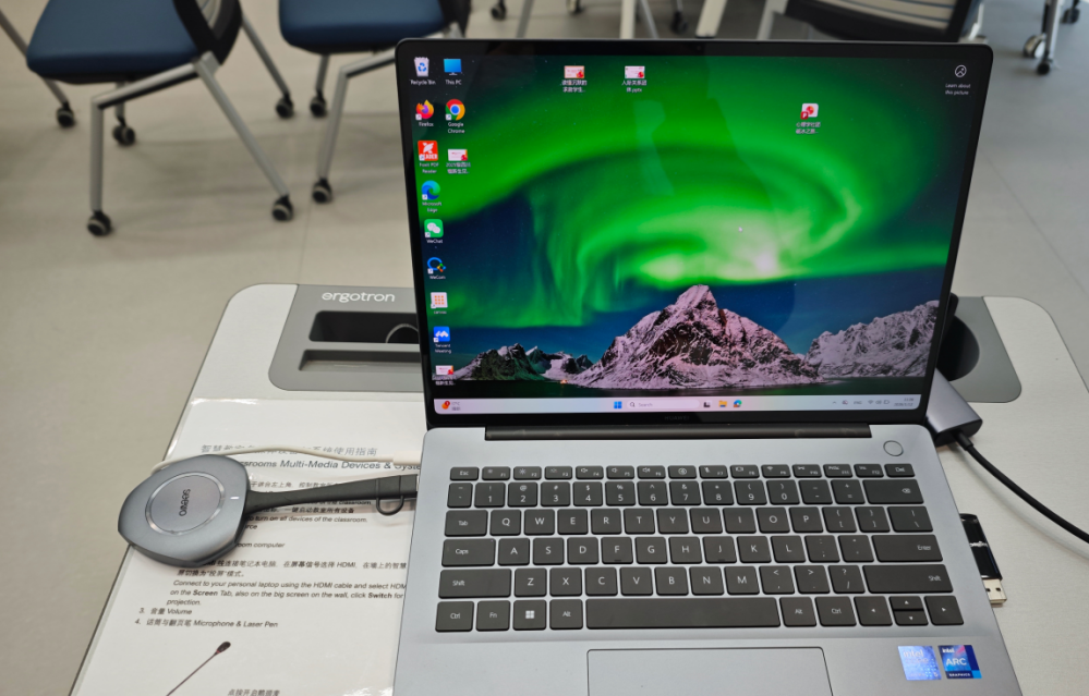 3.个人自带笔记本电脑,保持在Desktop选项,插入无线投屏器,安装驱动,等待指示灯闪烁至常亮后,按下投屏器投屏。