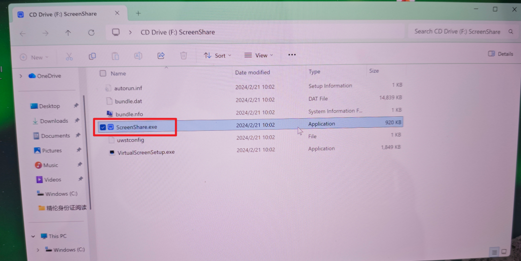 4.如果你的个人电脑没有安装过这个驱动,在文件管理中找到CD Drive盘,双击这个ScreenShare.EXE文件