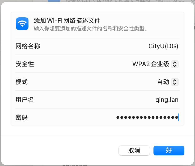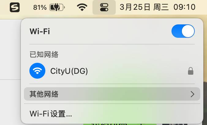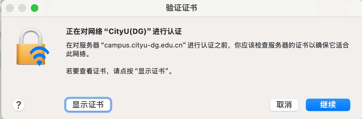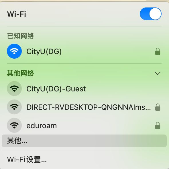 MacOS无法连接校园WiFi 正确连接方式:不要直接连接,需要手动添加1.点击右上角WiFi图标,选择其他网络; 2.继续点击其他;3.网络名称输入“CityU(DG)”、安全性选择“WPA2企业级”,输入个人网络账号密码;4.验证证书选择“继续”即可成功连接WiFi。